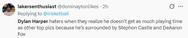 湖人球迷:那些说哈珀不稳定的、不像顶尖球员的人应该清楚,哈珀根本没有太多登场时间,而且他身边有卡斯尔、福克斯这样的后卫队友。